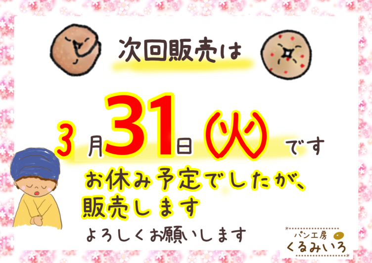 在庫状況 3月26日ありがとうございました 3月26日(木)雨の中、ご来店ありがとうございました。今日はいつもよりゆったりとした販売で、スコーンも閉店時間までありました😢雨の日は、遅い時間でも選べるチャンスです😅来週は少し変則的になります。本来... 2026/03/26 20:21 在庫状況