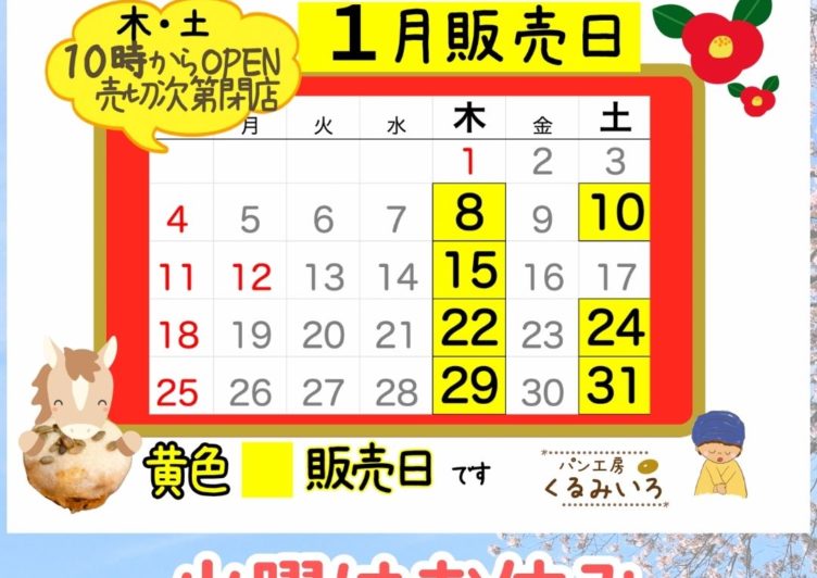 1月の販売日のお知らせです販売日 木、土10時~売切次第終了火曜日はお休みです12月27日(土)が年内最終日。1月8日(木)から販売しますよろしくお願いします