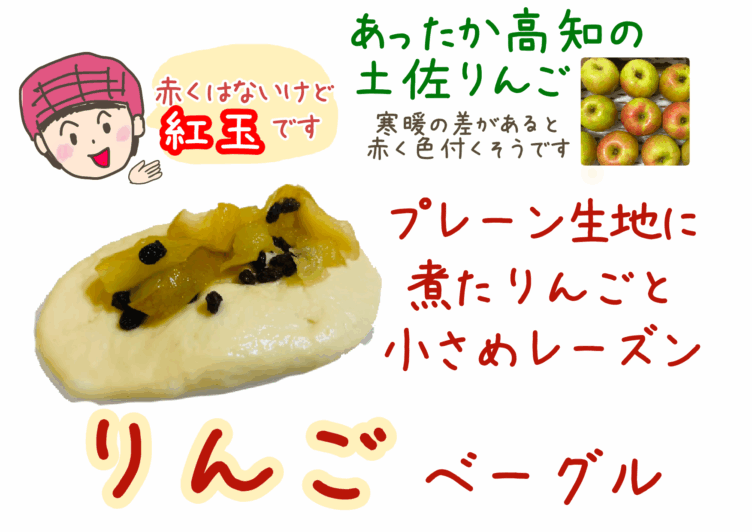 16日(木)、18日(土)のメニュー・高知産りんご(紅玉)・シナモンロール 復活です!!・チョコ&チョコ・ごま&あんこ(つぶあん)・ブルーベリー&クリームチーズ・チーズ・ソーセージ・プレーン・くるみ・...