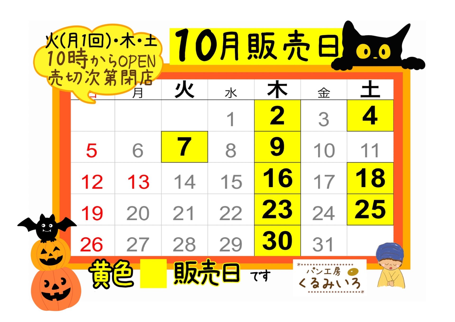 10月販売日 2025/09/29 11:51 この記事は約1分で読めます。 10月の販売日のお知らせです販売日 火(月1回)、木、土10時~売切次第終了第2週目の土曜日が1回お休みとなっております。よろしくお願いします