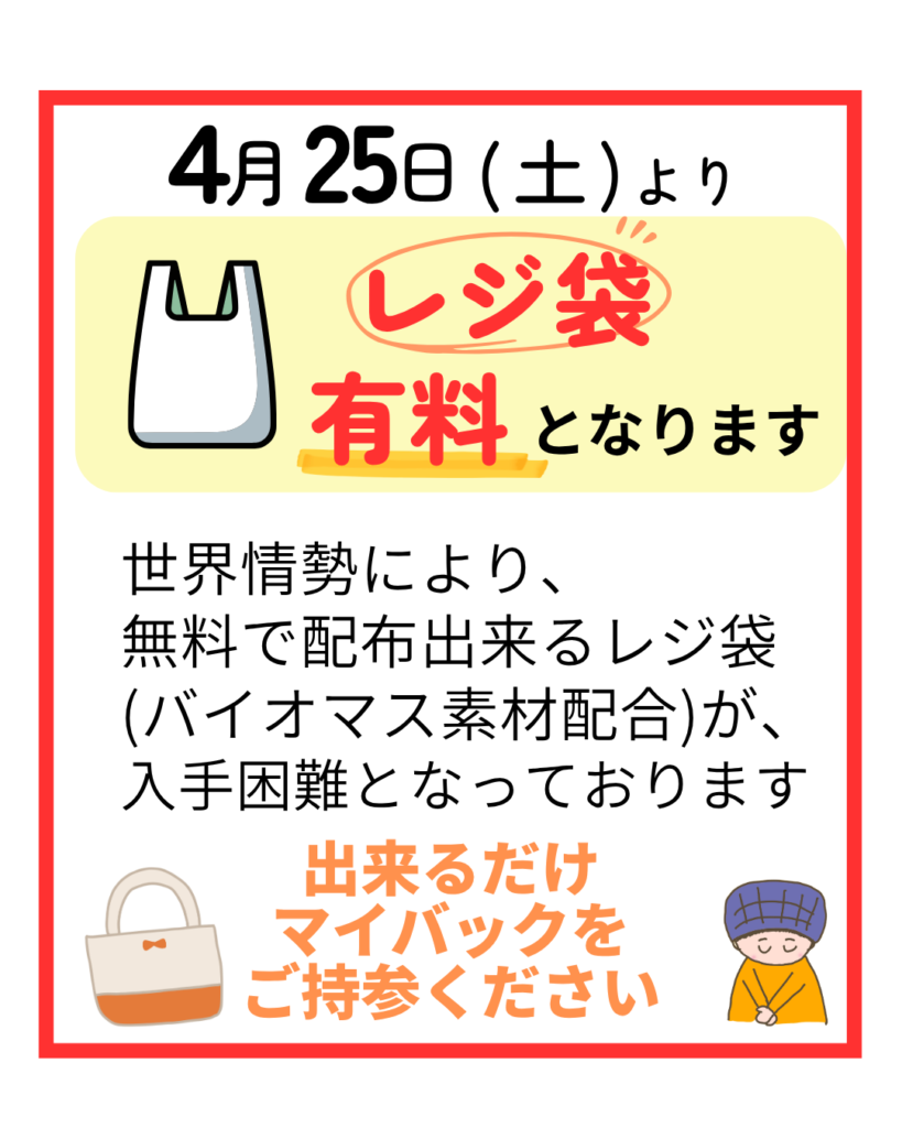 それから世界情勢により、無料で配布出来るレジ袋(バイオマス素材配合率が25%以上のもの)が、入手困難となっております